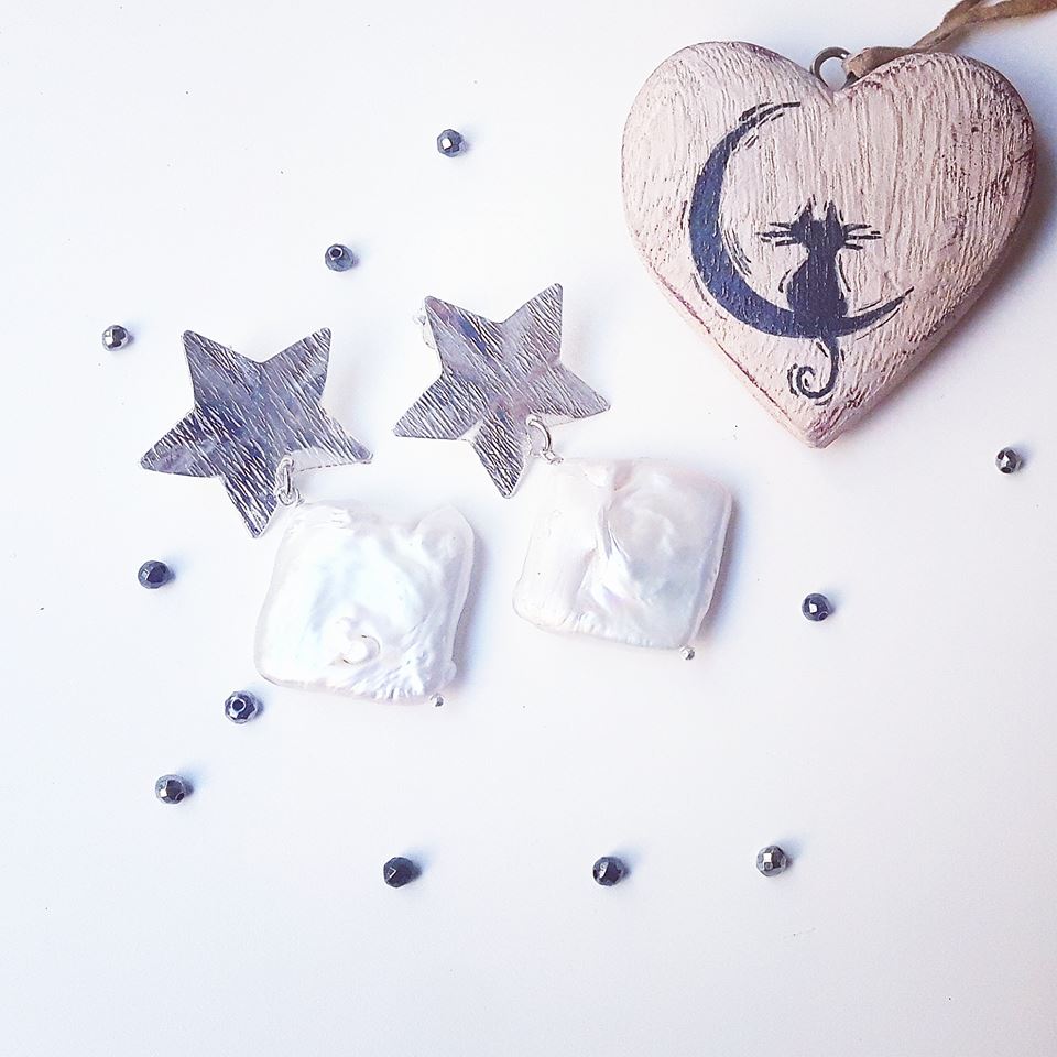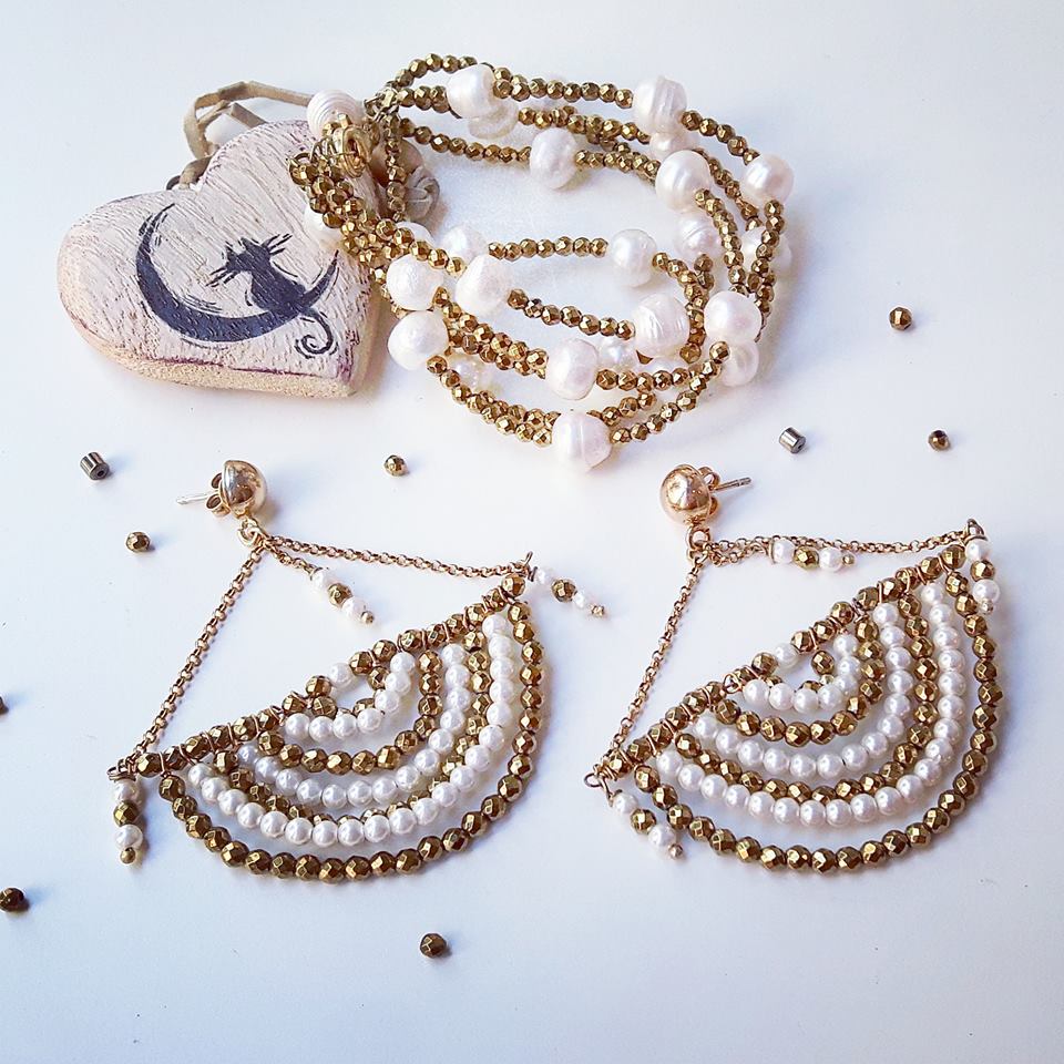 orecchini e bracciale in emetite e perle naturali, argento 925