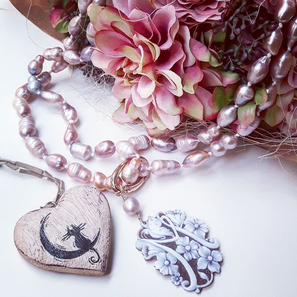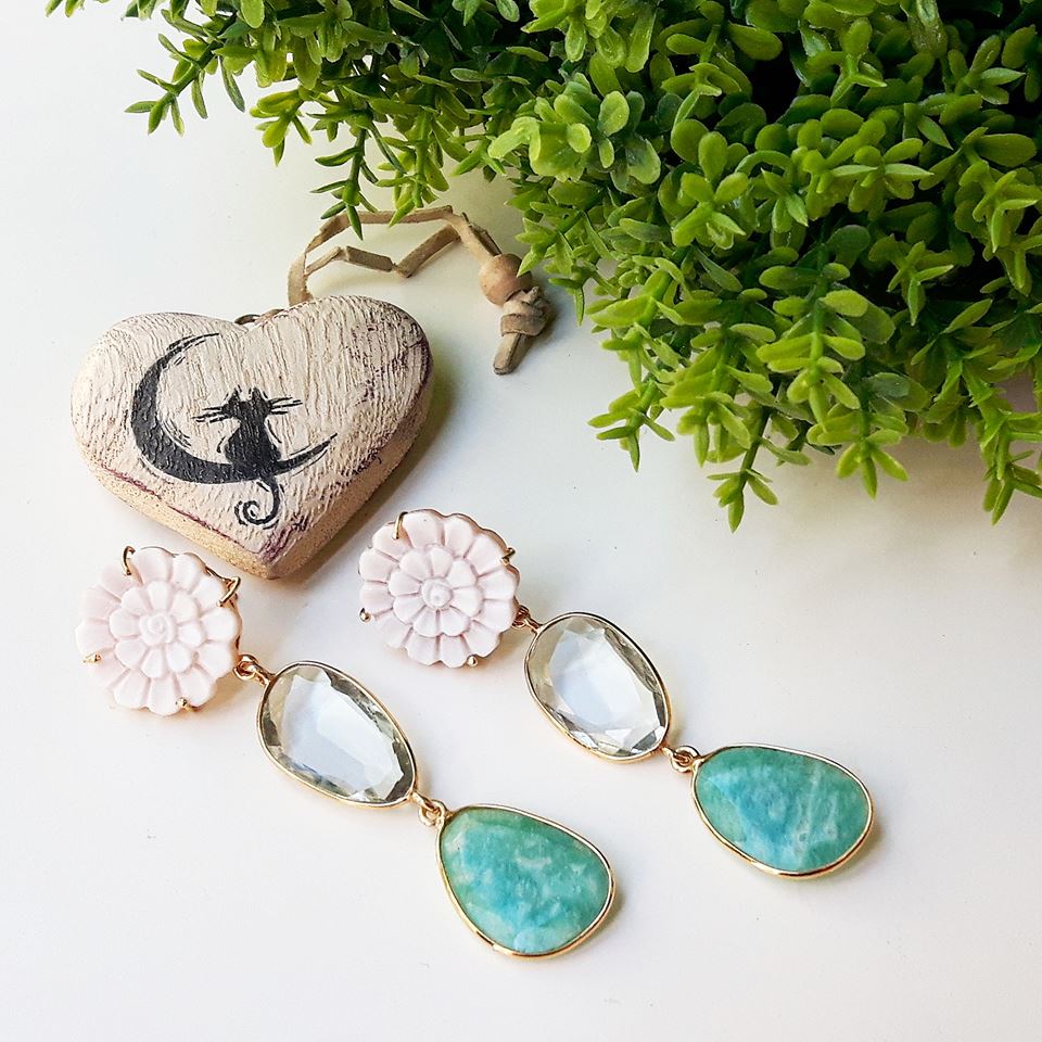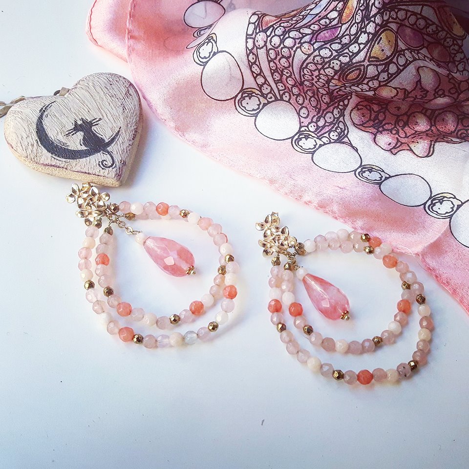 orecchini in tormalina, corallo, perle naturali, zama e argento 925